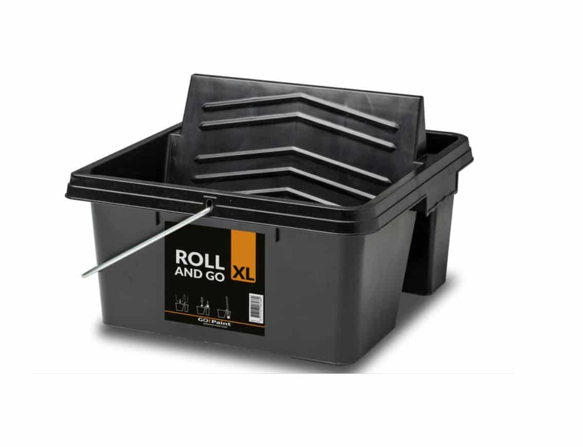 Roll and Go XL is een stevige verfbak die stabiel staat op de grond. Er zitten twee vakken in de Roll and Go XL die je kunt gebruiken. Het grote vak kun je vullen met verf. Het andere vak kun je wat gereedschappen of kwasten kwijt. Zo neem je alles in 1 keer mee naar je werkplek.