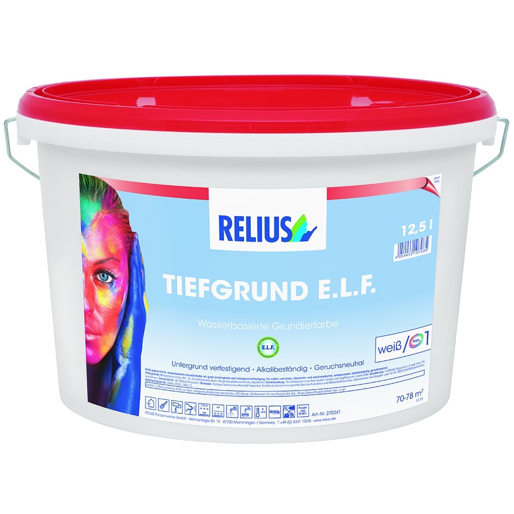 Relius Tiefgrund E.L.F. Weiss is een witte waterverdunbare hechtgrond, geschikt voor binnen en buiten. Geschikt voor zuigende ondergronden en het vastzetten van poederende ondergronden. Voor binnen ook geschikt om spaan- en houtvezelplaten voor te behandelen. Relius Tiefgrund E.L.F. Weiss is goed indringend, en verstevigd de ondergrond. Verfpoint is vakgrossier van Relius, met de Relius mengmachine kunnen wij dit product in diverse lichte kleuren mengen.