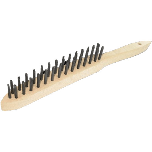 Staaldraadborstel voor het ontroesten van metaal en het reinigen van verschillende objekten. Houten blok en handgreep met ophangoog.